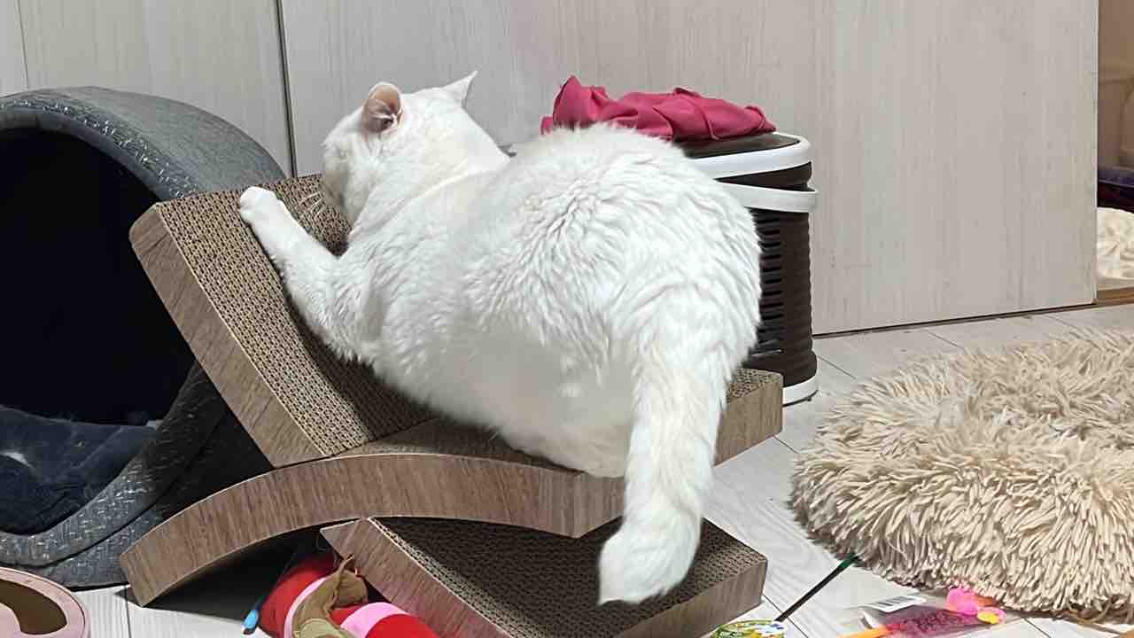 5周年記念にプレゼントした爪とぎでお尻ふりつつご機嫌爪とぎをする曉璘です。