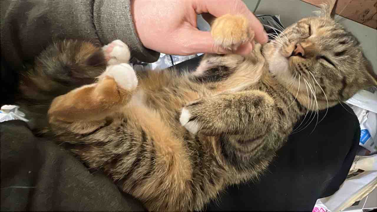 あいかわらず膝上好きな琥麦の得意ムーブである招き猫。