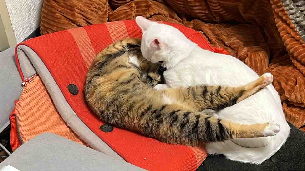 麿白先生のグルーミングを伸びてかわそうとする場面。