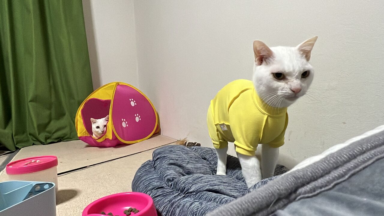 アレルギーの腹舐め防止でエリザベスを突破するので皮膚防護服を着用の麿白先生。