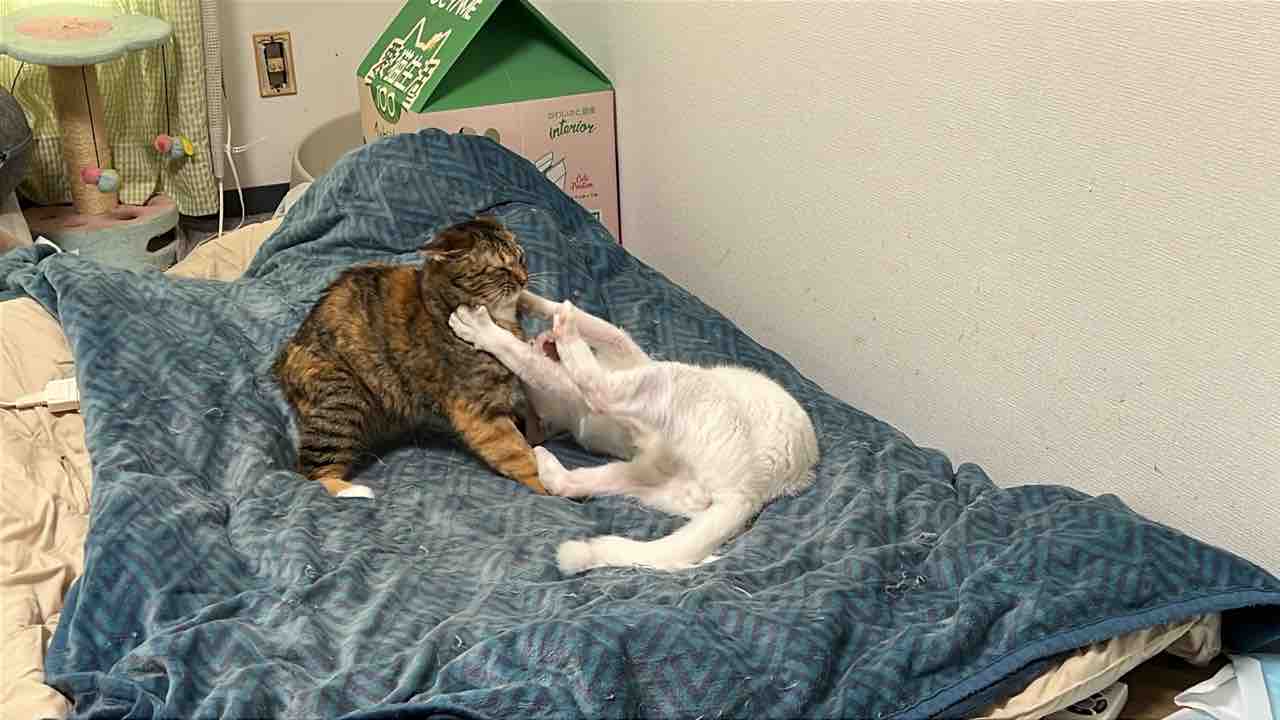 琥麦も甘えたいのに参瑚が割り込んでくるので麿白先生とくっつきます。