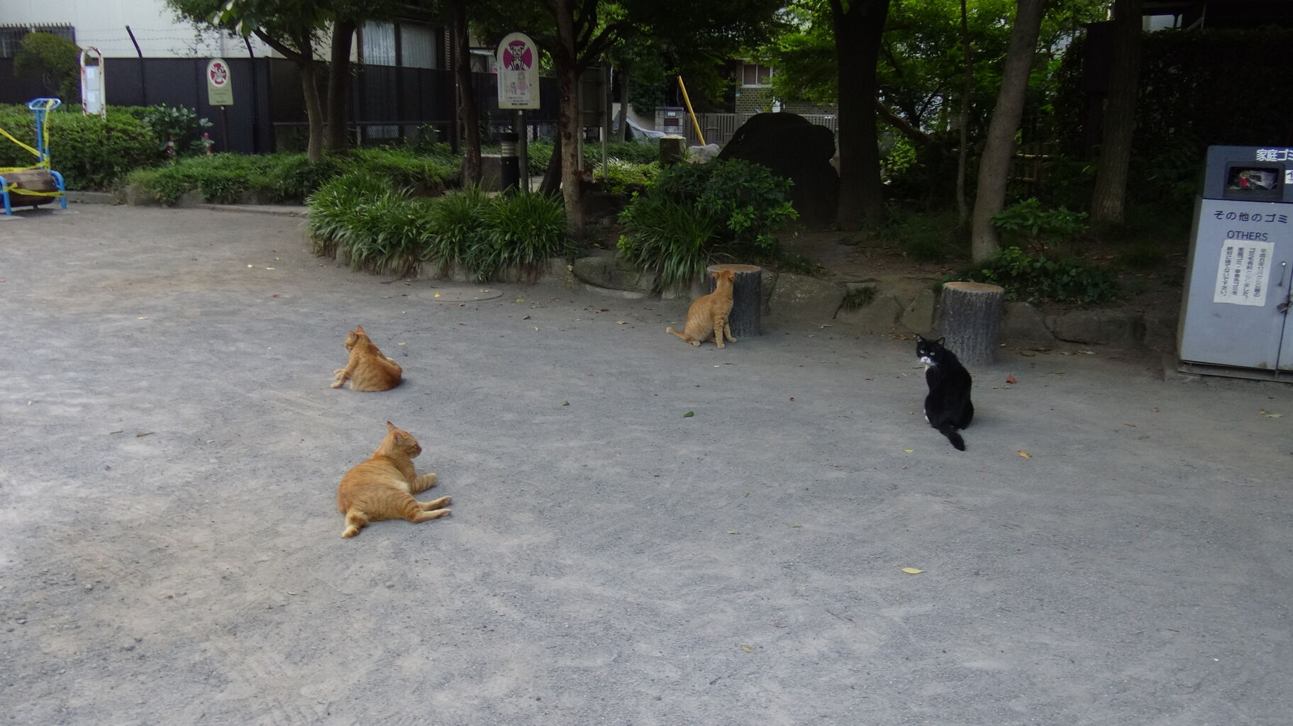 早朝の公園でくつろぐ茶トラ3兄弟に、1匹紛れ込むようになります。