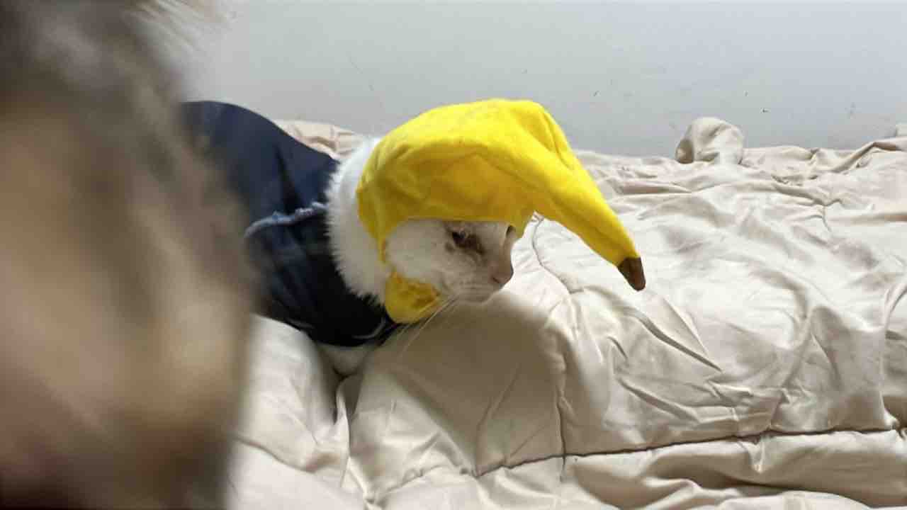 そこでバナナに擬態を試みるも目の前のヘタが気になる模様。
