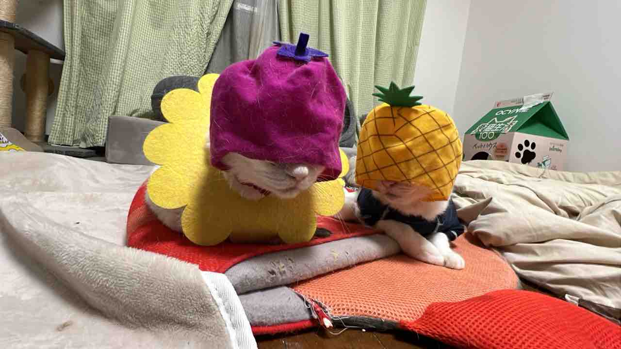 野菜とフルーツに擬態しての張り込みを行う珍妙警察コンビ。