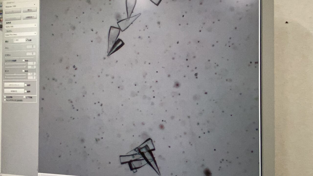 ひどくなるとこの結晶がそこかしこになり、拡大しなくても採取した尿から肉眼でキラキラ光るものが見えるそうです。